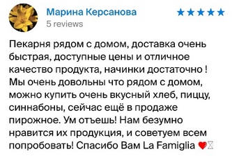 Представитель «LaFamiglia» в административном центре Свердловской области Екатерина Маркова настолько активно ведет свой бизнес, что рассказывать о ее достижениях «Бонплан» может практически каждый день. Но самое главное - клиенты пекарни ценят старания франчайзи. Они не только с удовольствием покупают выпечку Екатерины, но и оставляют большое число отзывов о ее работе.