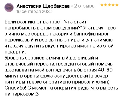 Итальянская ремесленная пекарня здесь работает более полугода. Ирина и Илья Глумовы любят кулинарию, а итальянскую кухню особенно. Поэтому и купили данную франшизу. Клиенты пекарни оценили их старания по достоинству. Это видно хотя бы по отзывам, которые они регулярно оставляют.